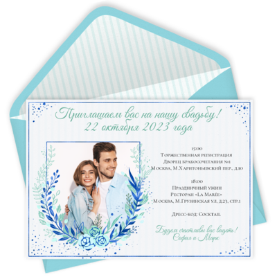 Онлайн пригласительные на свадьбу в голубом цвете. Посмотреть в каталоге