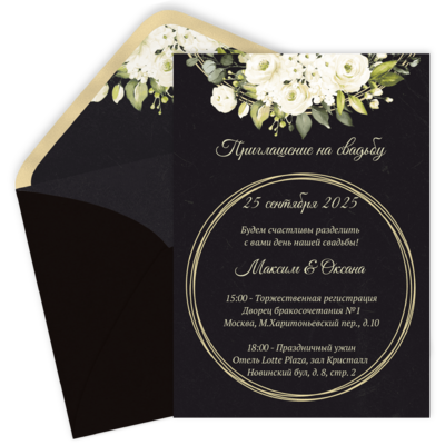 Электронные пригласительные на свадьбу в золоте на черном фоне. Посмотреть в каталоге