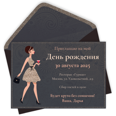 Вас ждет нечто совершенно особенное – мой юбилей! Приглашаю вас на праздник в стиле [указать стиль вечеринки], который будет настолько великолепным, что вы не захотите уходить.